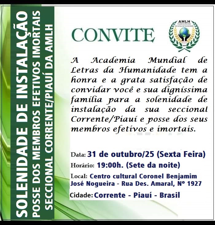 O mês de outubro promete ser marcante para Corrente, especialmente para os educadores, artistas e amantes da cultura. Conhecida como a capital da cultura do Extremo Sul do Piauí, a cidade se prepara para receber mais um importante marco em sua trajetória de valorização artística e literária: a instalação da Seccional da Academia Mundial de Letras da Humanidade (AMLH).