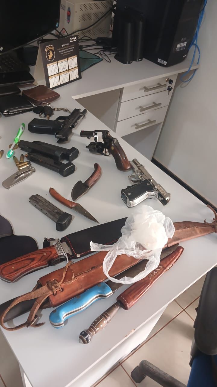 Durante a abordagem, foi apreendido com um dos suspeitos um revólver Taurus calibre .38, municiado e preso à cintura. Nas buscas realizadas nos automóveis, foram encontradas ainda duas pistolas calibre .380 (modelos PT 59s e PT 58s), 82 munições de calibres .380 e .38, sete armas brancas, um arbalete (tipo arpão), cinco aparelhos celulares e R$ 250,00 em espécie.