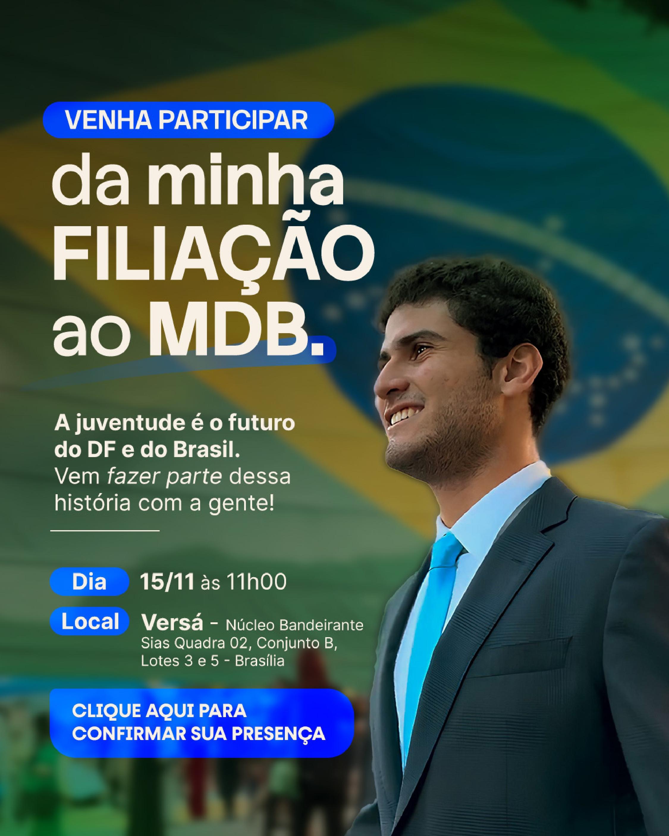 João Pedro Barros, de 20 anos, filho do governador do Distrito Federal, Ibaneis Rocha (MDB), vai se filiar ao partido do pai em 15 de novembro. O jovem empresário segue os passos de Ibaneis, que comemorou a decisão e destacou a importância da participação dos mais novos na política.
