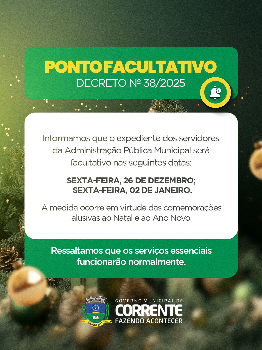 Com o decreto, as repartições públicas municipais terão funcionamento suspenso nessas datas, proporcionando a ampliação do período de descanso aos servidores e favorecendo a organização administrativa neste período festivo.