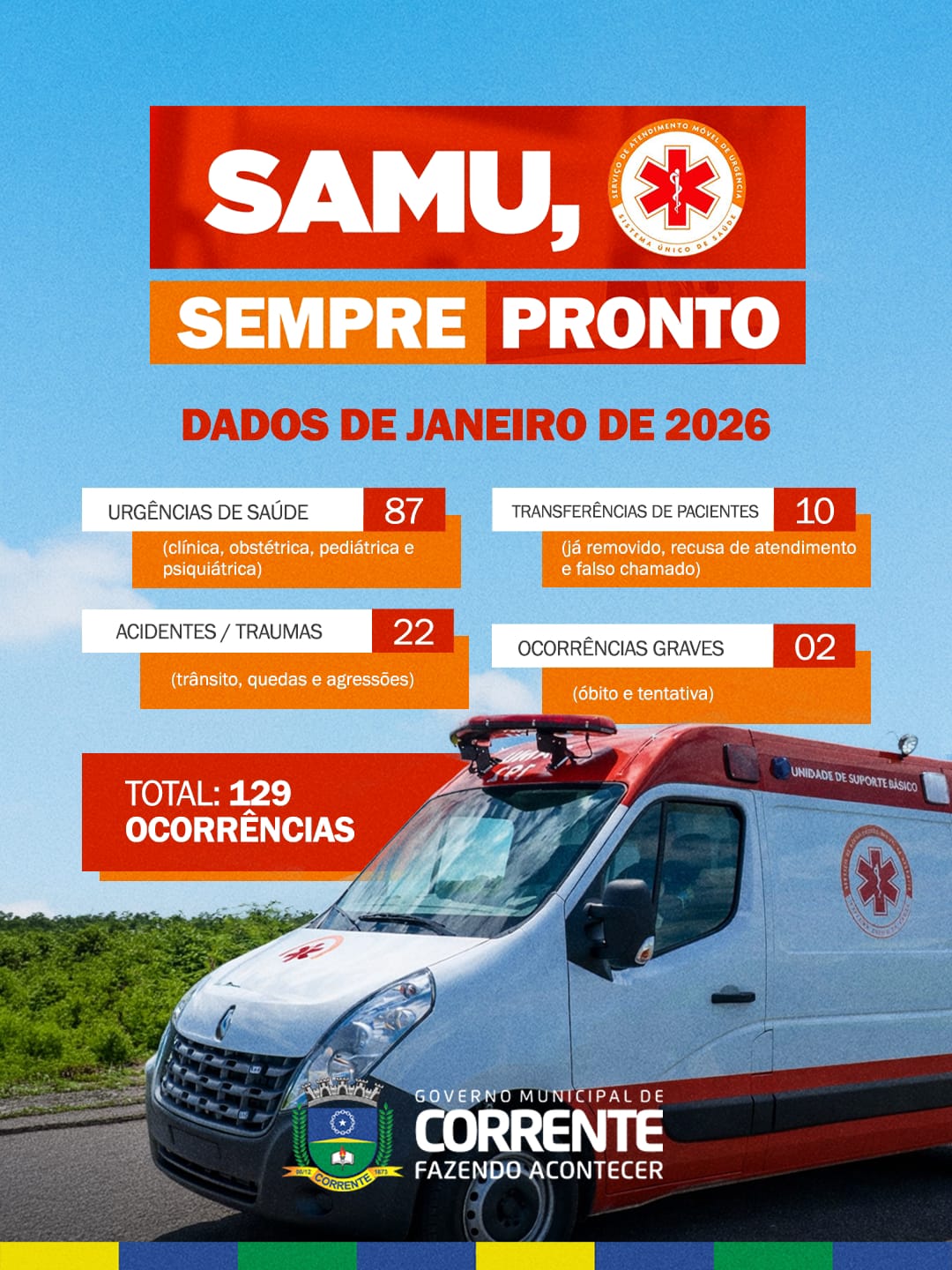 O Serviço de Atendimento Móvel de Urgência (SAMU) divulgou o levantamento oficial das ocorrências atendidas nos meses de dezembro de 2025 e janeiro de 2026, revelando números que demonstram a constância da demanda e reforçam a importância do serviço para a população.