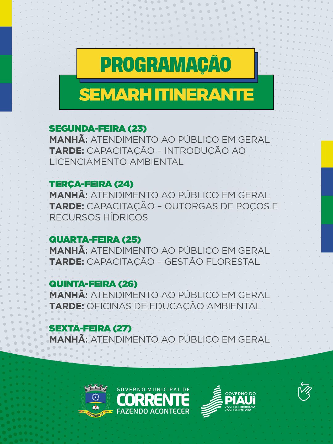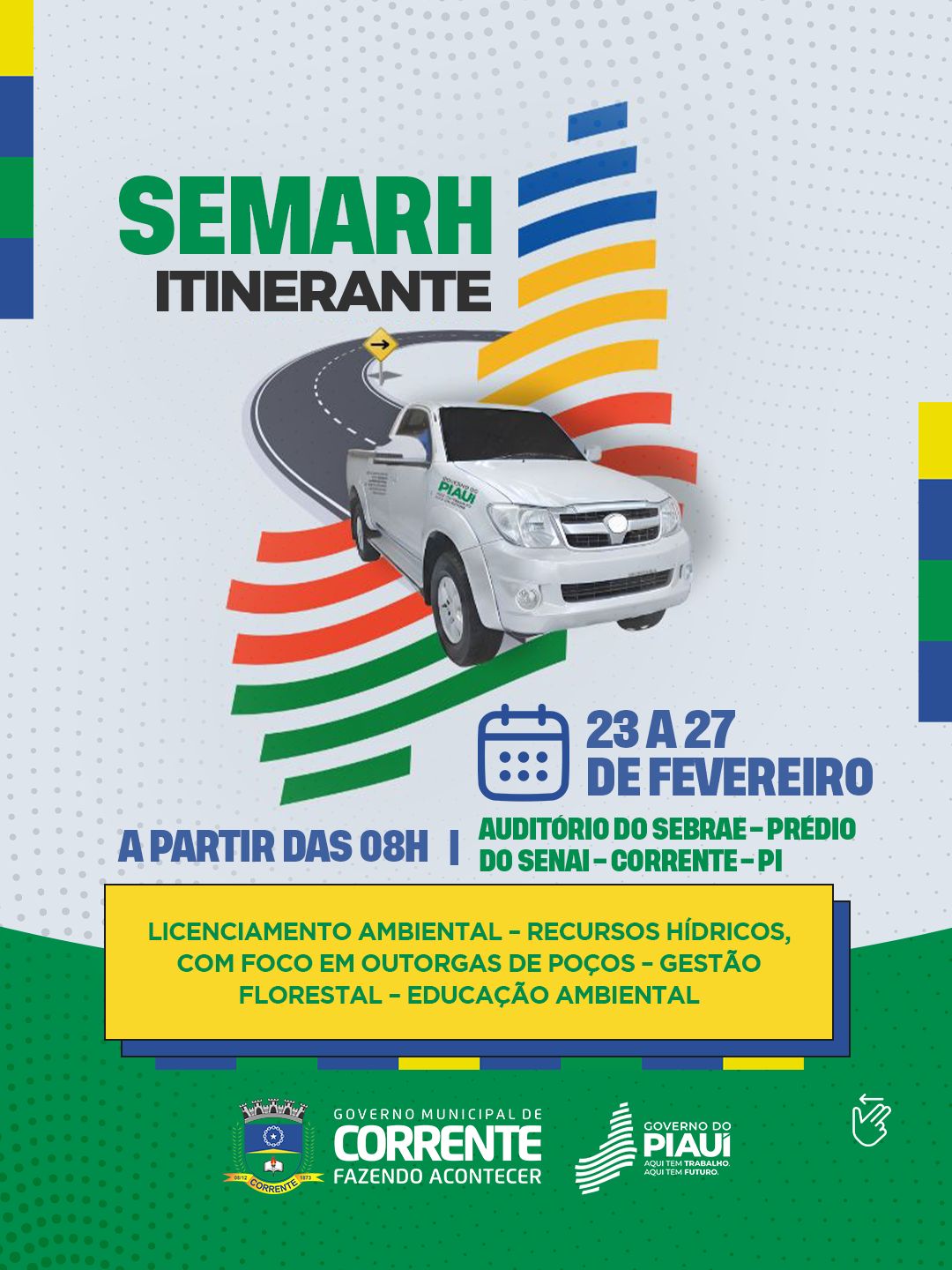 A cidade de Corrente receberá, de 23 a 27 de fevereiro, a ação SEMARH Itinerante, que levará serviços, orientações e capacitações voltadas à área ambiental para a população. O atendimento acontecerá no Auditório do SEBRAE, localizado no prédio do SENAI, sempre a partir das 8h.