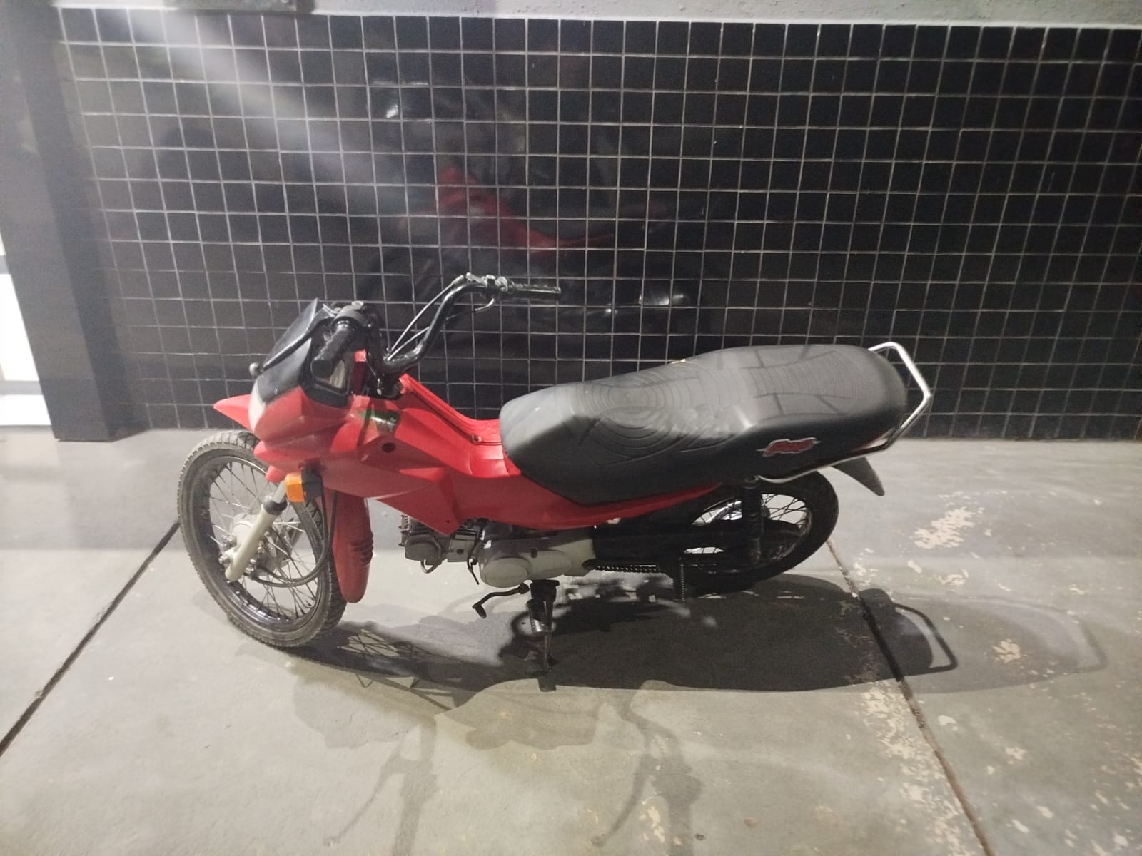 De acordo com informações policiais, W.P.S., 23 anos, conhecido como “Webinho”, conduzia uma motocicleta Honda Pop 100, cor vermelha, sem placa de identificação, realizando manobra arriscada ao trafegar apenas sobre a roda traseira — prática popularmente conhecida como “grau” — em frente à viatura policial.