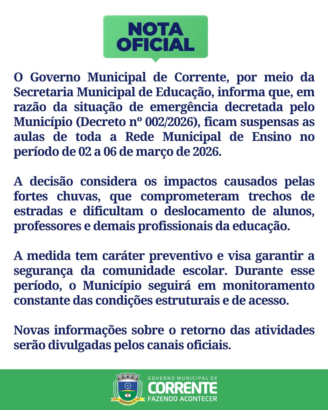 “O Governo Municipal de Corrente, por meio da Secretaria Municipal de Educação, informa que, em razão do período de fortes chuvas que atingem o município, ficam suspensas as aulas da rede municipal de ensino no período de 02 a 06 de março de 2026.