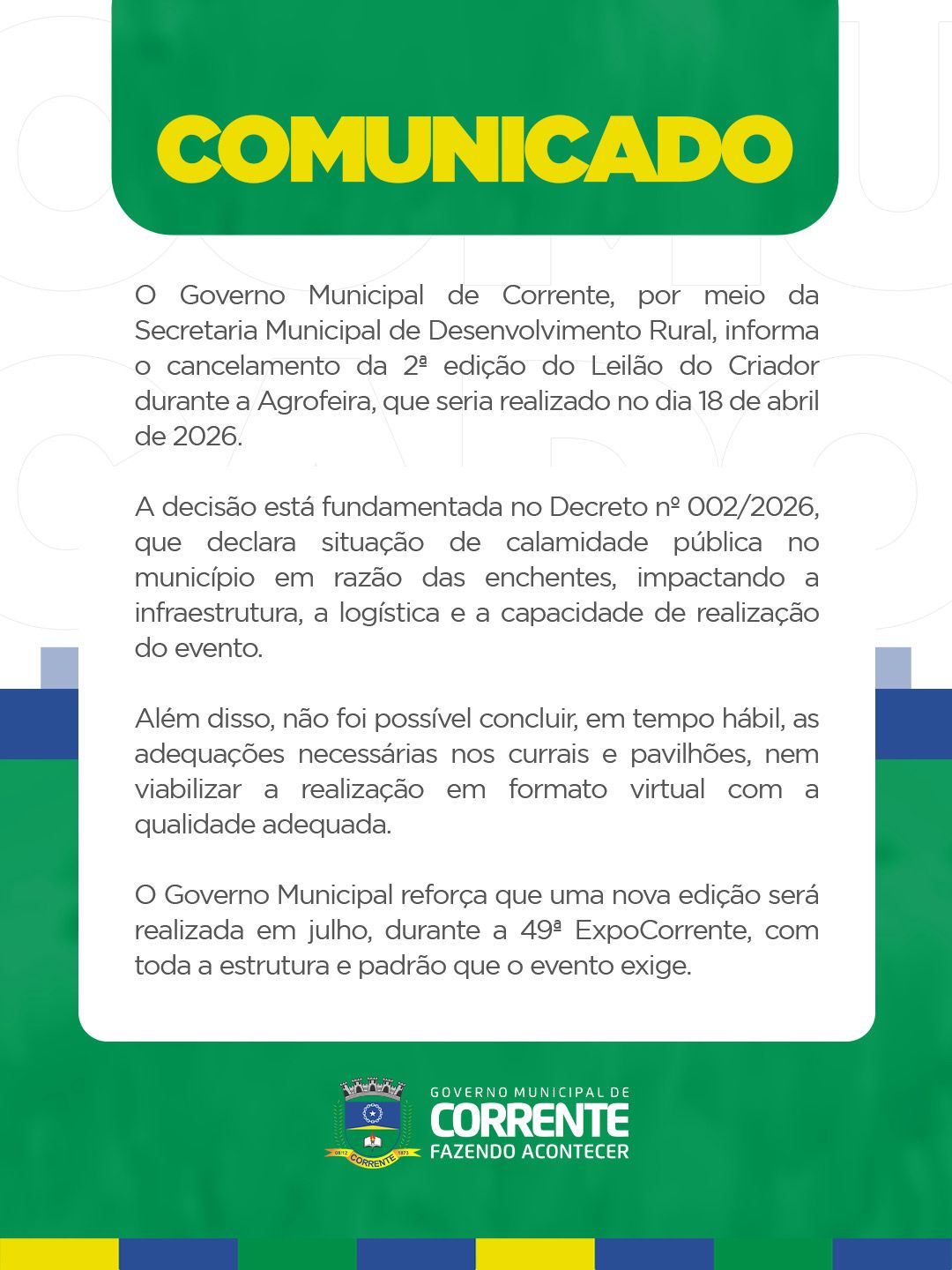 O Governo Municipal de Corrente informou o cancelamento da 2ª edição do Leilão do Criador, que estava prevista para acontecer no dia 18 de abril, durante a Agrofeira.