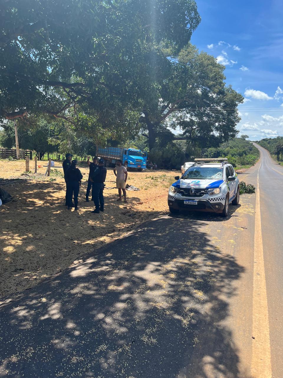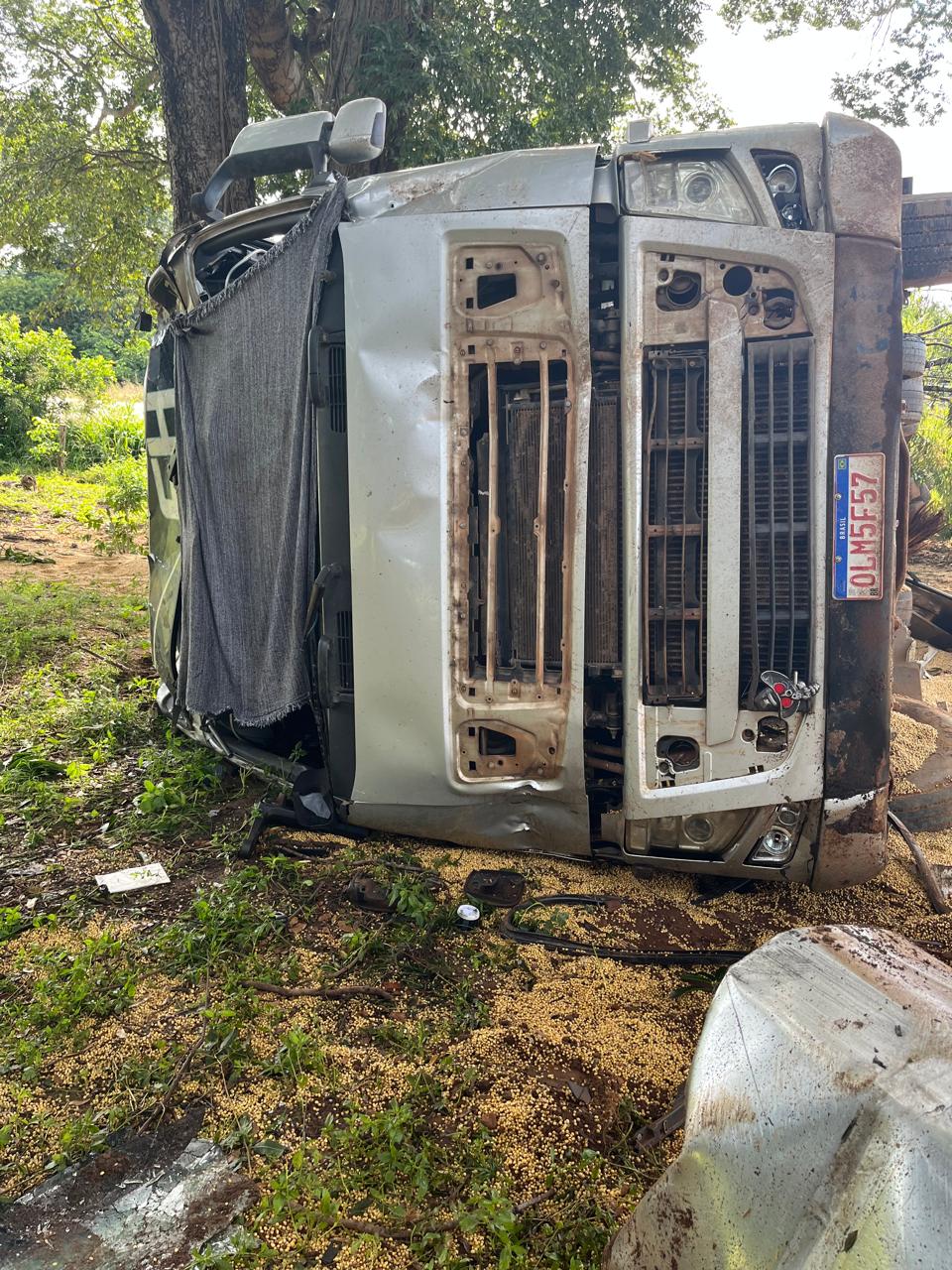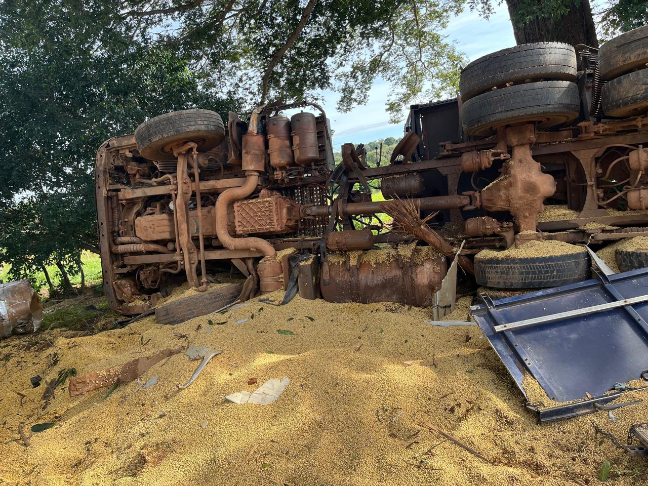 Ao chegar ao local, a equipe constatou a veracidade da ocorrência, encontrando um caminhão Volvo/FH, de cor prata, placa OLM-5F7, tombado às margens da rodovia, com carga de soja a granel espalhada pela pista.